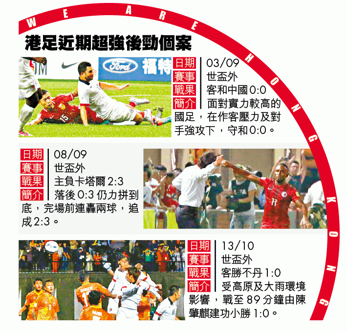港足九月作客以0:0守和國足,六天後回歸主場鬥卡塔爾,落後三球下於尾段追成2:3;上月作客不丹,面對高原氣候及暴雨,最終憑絕殺入球以1:0力保三分。球迷大讚港腳鬥志一流,但背後當然也要靠實力支撐,記得不丹一戰賽後,主帥金判坤也與記者笑說,球員能夠撐到最後一秒,全靠體能教練池田誠剛發功。