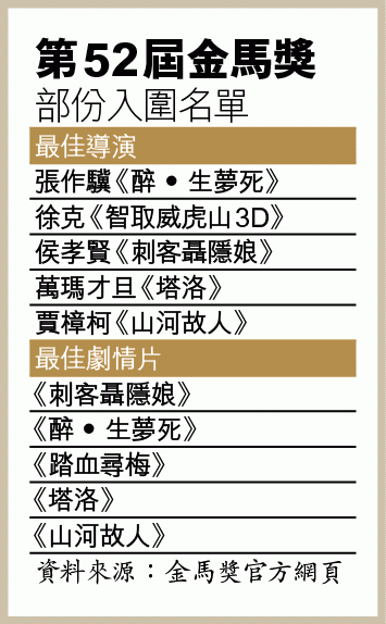 今屆金馬獎的競爭相當激烈,侯孝賢執導的《刺客聶隱娘》獲最多提名,合共11項提名,其次為張作驥的《醉.生夢死》,共有10項提名,兩片均會在最佳導演等獎項中碰頭。至於郭富城主演的港片《踏血尋梅》則有9項提名,包括角逐最佳劇情片、影帝及最佳原著劇本等。而張艾嘉的《華麗上班族》就獲提名最佳女主角等共6個項目。大會今次邀請了林志玲及黃子佼擔任主持,頗有看頭,另網上有不少直播連結提供。