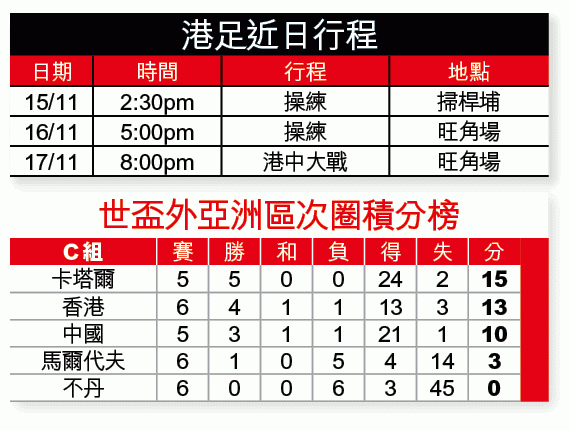 金帥昨晚解釋,閉門操練並非只避免戰術等外洩,而是想令球員更專注於去應付比賽。他說:「這幾天的運動動量不會太大,希望球員保留體力及精神應付對中國的大戰。形勢上,我們領先中國三分,他們的壓力比我們更大,球員狀態比四個月前作客中國時理想;還有新球員加入作為秘密武器,加上市民的助威及支持,有信心可達標。」港隊今午操練後便到酒店集宿。