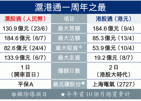 滬股通自開車首日爆額後即無以為繼,累計至上周近一年的餘額仍錄1,792.5億元(人民幣.下同),相對3,000億元總額度,意味只使用了四成,每日平均買額35.5億元,但日均沽額亦達31.3億元。更甚的是,最近19個交易日滬股通均連續走資錄最長走資潮,整體多達36.2%交易日均為走資,北上成交縱較南下稍活躍,但資金進出亦見波動。