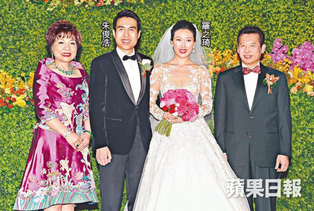 保良局主席朱李月華的30歲兒子朱俊浩,昨日迎娶拍拖9年的26歲室內設計師女友羅之琦,昨在灣仔會展筵開150席,現場佈置成愛麗斯夢遊仙境一樣,非常浪漫。劉嘉玲、呂良偉夫婦、四太梁安琪、袁詠儀、何超瓊、向華強夫婦、港姐麥明詩、諸葛紫岐和老公薛嘉麟等都畀面到賀。