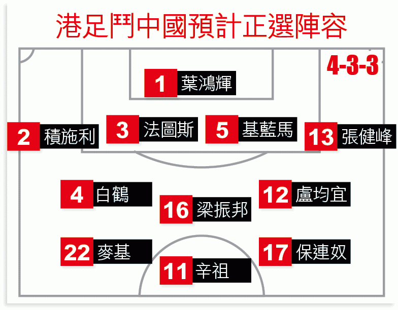 港足為免球員在大戰國足前受到不必要騷擾,昨罕有地安排閉門訓練,金判坤一如估計般試陣,從首個可能陣容所見,防線與上仗作客馬爾代夫時不變;中場為提升防守效率,林嘉緯或退居後備,改由白鶴與梁振邦組雙防中,配合盧均宜策劃。至於鋒線則以辛祖替代艾力士擔任中鋒,其餘兩人為麥基及保連奴,相信是希望借辛祖較強的控球能力,作為進攻第一點。港足整課操練演練了多個不同攻守組合,惟三線中軸人選沒有太大變動。
