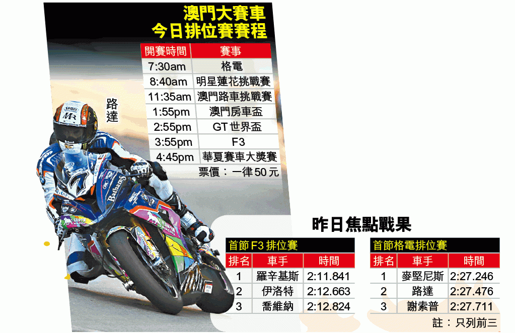 悶熱天氣下,一眾「過江龍」亦不能倖免。在剛結束的GT亞洲盃賽季與Adderly份屬隊友的日本車手澤圭太,連續第10年來澳門參賽,他不諱言今年是感覺最熱的一次;要數最誇張「演繹」的,則非八屆格蘭披治電單車冠軍、英國車手路達莫屬。路達笑稱現場感覺似有40度,又指他記憶所及,澳門大賽車期間對上一次面對如此酷熱天氣,應已是1998年或2000年。被問到有否信心贏得第九冠,43歲的路達笑指自己年事已高,車壇亦不乏後起之秀,加上駕駛全新戰車出戰,只能盡力而為。路達上次稱霸已是三年前,他昨在格電首節排位賽造出2分27秒476,僅比第一位的同胞車手麥堅尼斯慢0.23秒。格電今晨七時半進行第二節排位賽。