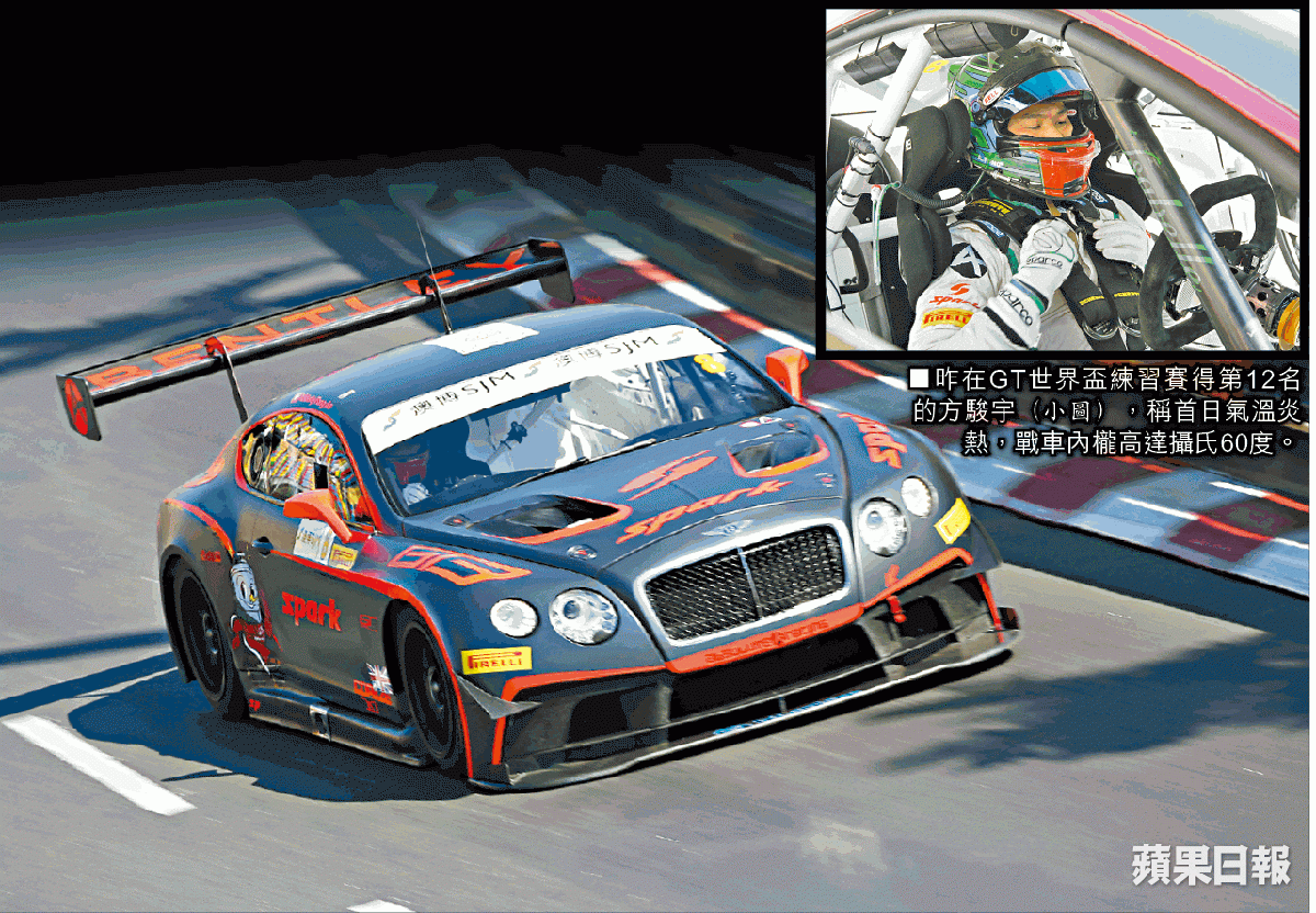 效力Craft Bamboo車隊的歐陽若曦(Darryl)在GT世界盃首天練習賽以第四名完成,比頭車慢不足兩秒,這位曾揚威東望洋的香港車手直言昨天氣溫有點異常,又謂往年少有這般熱,對表現多少有影響。同樣認為天氣太熱的賓利絕對車手方駿宇,在練習賽只排12位,但他表示首天仍在摸索階段,尚未完全發揮戰車馬力。Adderly說:「戰車初步設定並不適合今年比賽,因為天氣實在太熱,路面亦比過往巔簸。以首天來說,我們缺少戰車在如此高溫下比賽的數據,再次比賽前要作微調。」Adderly又稱,GT戰車車身較大,車手在車內動作較多,加上賓利屬前置引擎,熱力由車頭傳至車側再滲入車箱內櫳,車內溫度可高達60度。