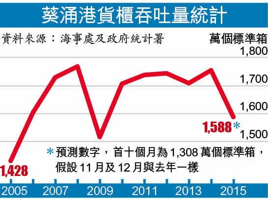 另一組數字是本港港口貨櫃吞吐量。今年頭十個月,葵涌港處理的吞吐量累計有1,308萬個標準箱,較去年同期跌了11.5%。由去年8月開始,葵涌港吞吐量開始下跌,至今年10月止,已連跌15個月。頭四個月,跌幅只有3%以內,但去年12月至今年10月,卻有八個月時間,跌幅按年跌了超過一成以上。