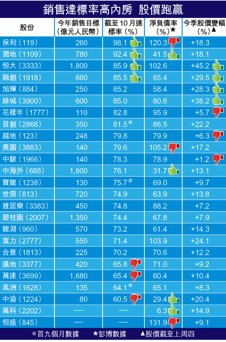 本報綜合25隻內房股截至10月底止的銷售情況,發現高達標率的房企股價表現普遍跑贏,最標青者為達標率86%的恒大(3333),截至周四止今季累升45%。