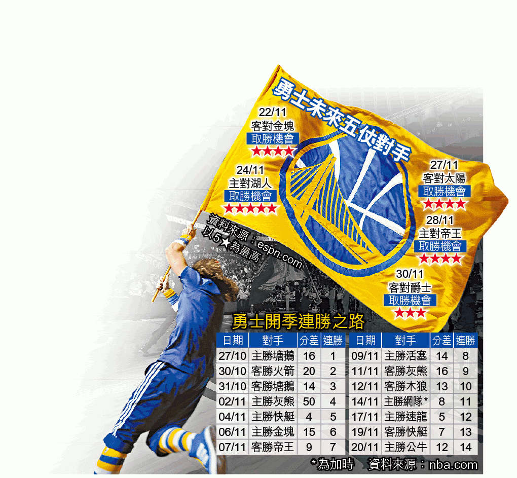 上周五舉行的常規賽,勇士憑着當家球星史堤芬居里(Stephen Curry)轟入27分,以106:94擊敗公牛,將球隊的開季連勝紀錄改寫至14場,距離追平NBA史上最佳開季成績僅剩一步之遙!