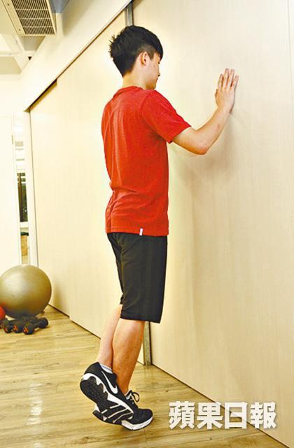 方法:雙手扶牆,左腳蹺右腳,右腳的腳尖撐起1秒。然後慢慢放下,但腳跟保持不着地。每組做15下,休息1分鐘,共做3組。左右腳輪流做