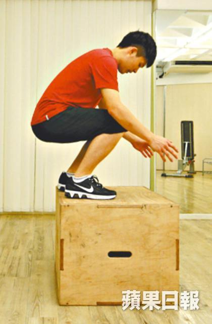 方法:雙腳與木箱保持約1呎半距離,先蹲下,雙手拉向後,呼氣跳上木箱。每組做15下,休息1分鐘,共做3組