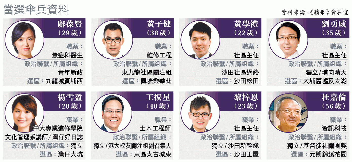 同一傘下,當選傘兵還有56歲的杜嘉倫,他參選元朗錦綉花園選區,以1,826票壓倒當區做了27年的現任區議員邱帶娣,高出230票。他參選前,既沒往績也沒地區工作,參選猶如「爬上一個高山」,街坊求變心切促成登頂,「證明選民如果願意出嚟,民主聲音就會強」。杜和徐子見都積極參與雨傘運動,不會刻意掩飾經歷,杜嘉倫說:「我會好大方咁話畀大家聽,佔中期間我每晚都喺金鐘教牧站。有個別街坊話唔要建制派,渴望民主聲音。」