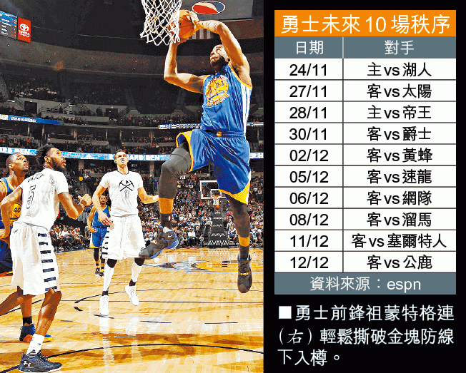 【蘋足全場】勇士平NBA開季連勝紀錄!上季總冠軍勇士新季保持勇態,周日未盡全力下,仍以118:105作客擊敗金塊,開季連勝走勢增至15場,平了聯盟紀錄;周二只要主場拿下弱旅湖人,就可獨攬紀錄。