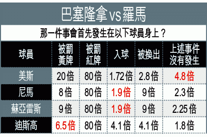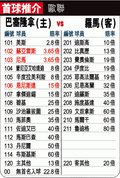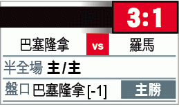 剛有美斯復出,並在國家打吡大勝,氣勢如虹的巴塞隆拿,在周二歐聯分組賽E組賽事迎戰羅馬,勢再下一城,鎖定出線席位。對手羅馬攻強守弱,今造訪魯營球場可望出現大手交易賽果,「入球大細」中位數開3.5球,照捧入球「大」。(球賽編號:星期二8;有線62及202台明日3:45am直播)文:何西
