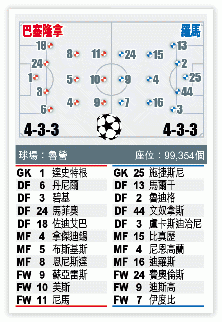 更好消息是,因傷休戰了近兩個月的巴塞前鋒美斯,終於在上仗復出,雖然表現平平,但他在下半場入替時戰局已大定,毋須太過落力;預計今仗將會獲得更多上陣時間,「MSN」組合再度合體,對羅馬後防線而言絕非好消息。