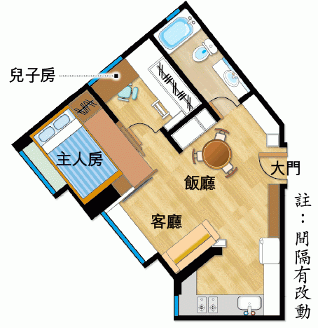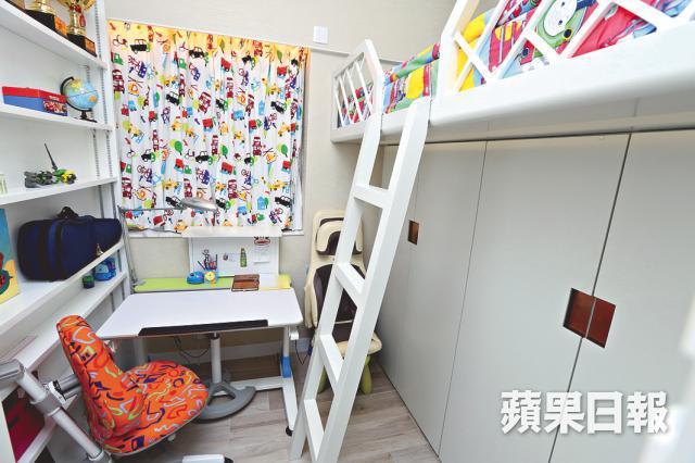 兒子房撥出部份空間予飯廳造櫃,但向原則過大的浴室偷位,一減一加無蝕底。兒子讀小學一年級,尚在成長階段,房間設計具持續性,書櫃、書枱、雜物櫃、衣櫃及睡床五臟俱全,地方有限,計清計楚四方八面尺寸大小,特建高架床,騰出床底、窗前及房門側凹位放其餘家具,空間盡用莫過於此。