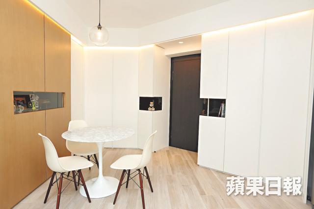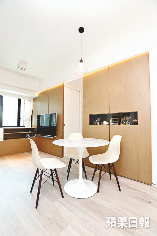 由於單位面積小,用色越簡單越好,客飯廳及主人房以淨白配木,大方得體無雜亂。