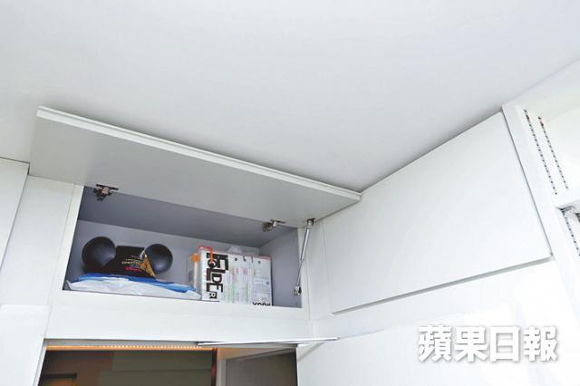 梳化後廚房入口也歪,造了一個突起的鞋櫃,伸長拉直少少,盡量與另一邊對稱,從正面看左右工整順眼,乾脆不裝廚房門擴闊通道,出入鬆動更開揚。向兒子房偷位造的大櫃玩偽裝,表面扮木牆,只見中間玻璃層架放精品,查實木牆是趟門,推開發現內有衣架掛通可放衫,還擺放玩具、膠箱及行李箱等,容量之多令人嘆為觀止。