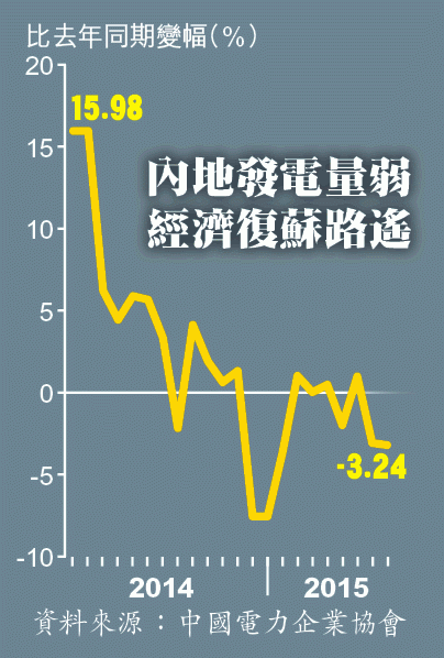 中國經濟大疲弱,被指是近年商品的大弱勢元凶。去年起內地開始放水救市,但最新數據顯示,經濟至今仍沒有復蘇,且有惡化迹象。由於中國製造業的能源使用效率較低,過往發電量增長一直高於經濟增幅,2013年增幅仍為7.6%,2014年增幅下降至3.2%,今年起更全面轉跌,9月及10月持續下跌,今年頭10個月發電量出現0.1%的跌幅,情況極為罕見。