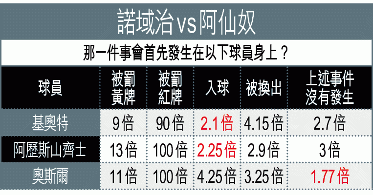 阿仙奴雖然前仗作客不敵西布朗,但開季五勝二負的成績,仍是英超最多作客勝仗的球隊,兵工廠上周中也反底,3:0大勝薩格勒布戴拿模,保持歐聯出線希望,梅開二度的阿歷斯山齊士大腿雖有輕傷,惟領隊雲格希望他今仗後才休息,無疑球隊仍有阿迪達、高基連及路斯基等中場傷兵,幸威爾斯國腳艾朗藍斯上仗已後備復出,加上阿歷士張伯倫亦傷癒可候命,兩人都可串演防中,減輕了辛迪卡索拉的負擔。以兵工廠早前已3:0大勝屈福特,今仗再遇另一升班馬諾域治,有力再添勝仗。