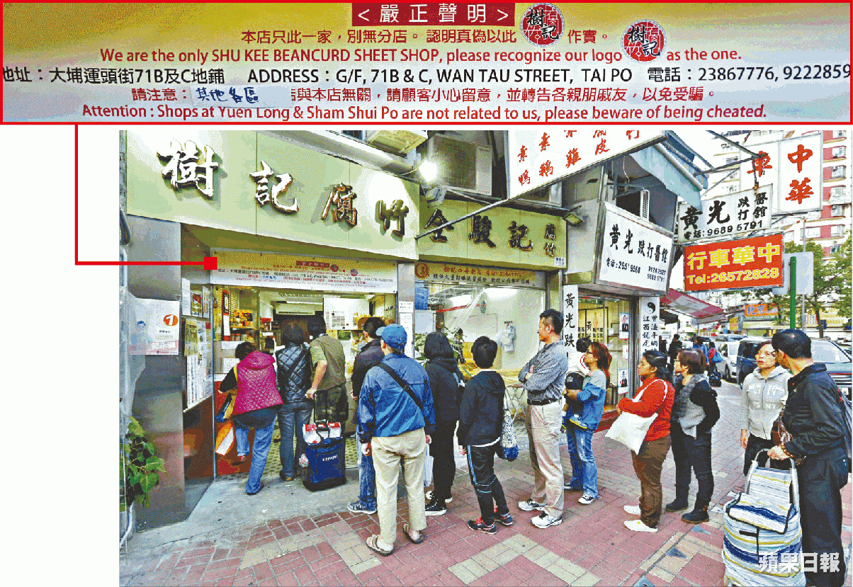 【本報訊】以腐竹聞名的深水埗老字號樹記腐竹,去年4月因第二代掌舵人孔氏兄弟拆夥而結業,惟翌月即有同行懷疑冒名在同街開業賣樹記豆品,及後更加開分店兼搶先為樹記登記商標。孔氏認為冒牌店影射,前日入稟高等法院禁制對方繼續使用樹記商標,要求對方改店名及賠償。律師明言,成功建立的商譽屬於私有產權,後人不會因為商舖結業或未有註冊而喪失該權利。