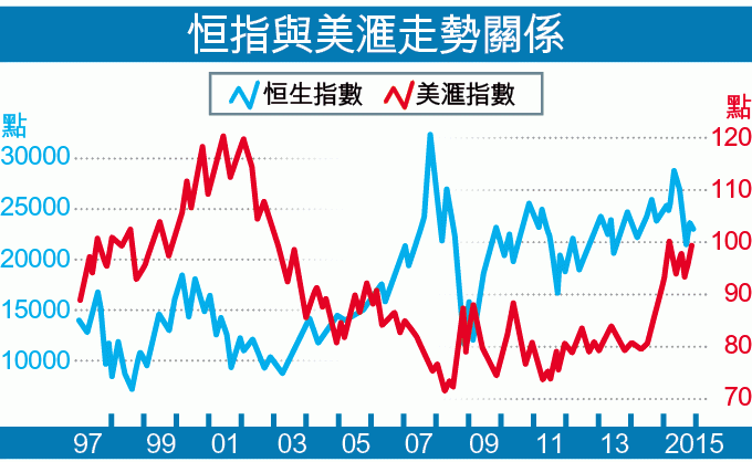 量度美元兌一籃子貨幣價值的美滙指數(DXY),上周五收市企穩100樓上,由去年第二季80水平至今,DXY年半間升了25%。DXY升穿100,對港股港樓而言都是利淡訊號。97年中DXY升穿100,同期恒指亦見頂,及至98年中,DXY升見105,恒指低見8000點水平。2001年至2002年,DXY高見120水平,港股以至樓市同樣呈下跌走勢。另一個更好例子是2007至2008年,DXY由85跌至近70水平,同期恒指則由二萬點飆升至三萬點樓上。簡言之,美金強,港股港樓冇運行。