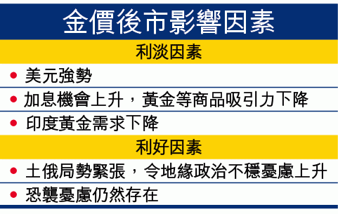 雖然土俄局勢或令黃金等避險資產有上升的可能,但德國第二大行德國商業銀行的分析師指地緣政治因素的影響力暫時有限,在各種利淡因素影響下,金價仍是會跌。