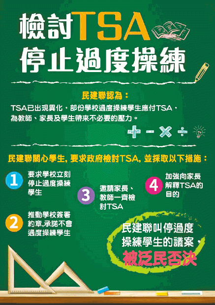 【本報訊】民建聯多名立法會議員不贊成取消小三全港性系統評估(TSA),但該黨前日在facebook貼圖,反斥泛民否決其叫停過度操練學生的議案。一眾家長見狀,立即狂轟民建聯誤導市民,貼文1日間累積逾2,000個留言、4,000個轉載聲討,群情洶湧。發起爭取「取消小三TSA」的網上群組召集人金怡寧批評,教育局和民建聯一直無視家長反對聲音,勢激發更多人出席今日舉行的公聽會,向TSA說不。
