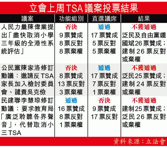 立法會教育事務委員會今日召開特別會議,為TSA舉行公聽會,預料有逾130人發言,亦有家長會在場外請願,促盡快取消TSA。將出席會議的爭取「取消小三TSA」召集人金怡寧指,前日教育局選擇性地邀請家長出席研討會,又有民建聯「賊喊捉賊」,劣行令家長極為憤怒,不少原本未表態出席公聽會的市民,已紛紛在網上改稱將會出席。