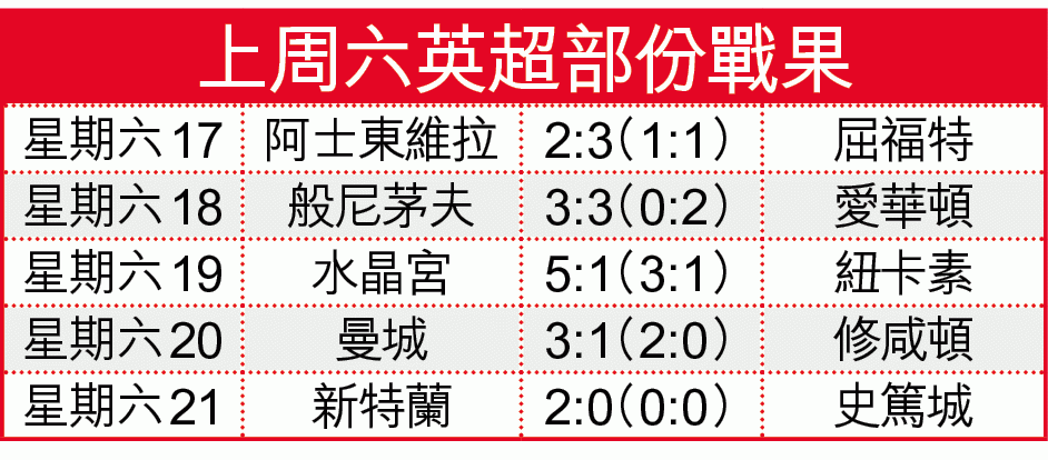 上周六英超聯賽,曼城憑奇雲迪布尼、戴爾夫及高拉洛夫各建一功下,主場3:1擊敗由沙恩朗破蛋的修咸頓,一洗兩連敗頹風,但首席射手阿古路又再傷出,令球隊傷兵名單上又添星級戰將。