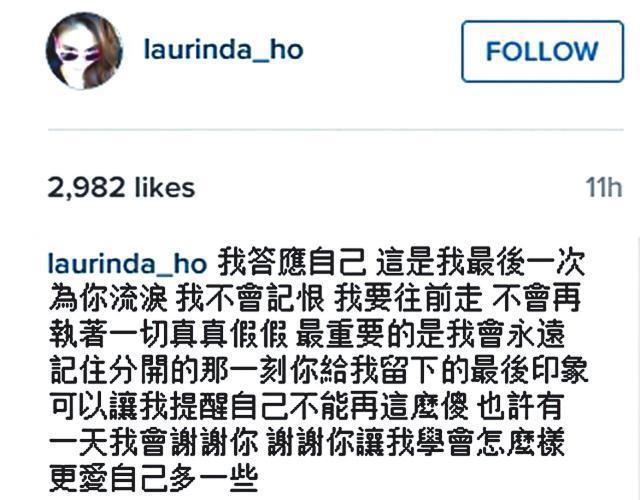 賭王何鴻燊的「最索千金」何超蓮,於四年前情傾台灣歌手吳克羣,當時超蓮被影到孖吳克羣到陽明山蜜會,「超克戀」正式曝光,兩人雖發展異地戀,但愛得十分癡纏,就算克羣因父母婚姻失敗,令他有不婚主義,戀愛大過天的超蓮都沒放棄這段情;然而,最近兩人卻頻傳情變,昨凌晨4時許,睡不着的超蓮漏夜在Instagram發表分手宣言,「超克戀」一刀兩斷。