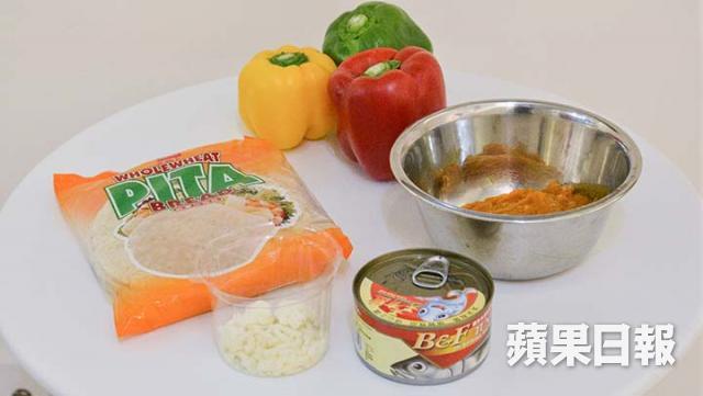 3. 倒出吞拿魚罐頭的水份,把吞拿魚平均鋪在比得包上,再鋪上切粒的三色椒