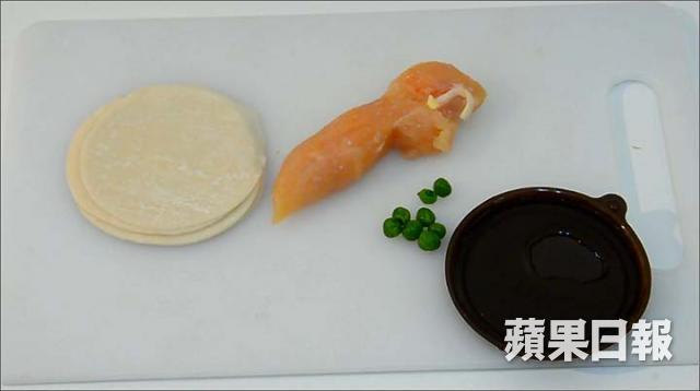 2. 用手沾水,弄濕雲吞皮的底和面,然後把雞肉包在雲吞皮內,包雲吞皮時可沾水黏實對摺的位置,讓雲吞皮不會散開