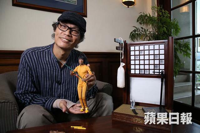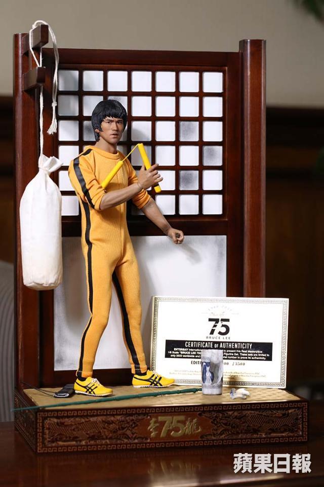 今年是一代武術巨星李小龍誕生75周年的日子,有本地人偶公司便推出了全球限量3,500個的李小龍人偶,配上大量配件及大型場景吸引粉絲進貢。人偶以《死亡遊戲》電影造型作藍本,其實對一般人來說,這人偶已算相當像真,但對超級粉絲的插畫家周少康來說未知又是否滿意呢?周少康自言從十多歲起已有留意李小龍後演戲,到後來李小龍回港拍功夫片更是完全迷上。而身兼設計師和插畫師的周少康,多年來亦當然畫下不少偶像的插畫,剛剛更舉辦了李小龍75周年的畫展,對偶像的身形面相自然是觀察入微,甚有研究,今次品評這ENTERBAY出品的李小龍人偶當然也要求甚高:「最欣賞是它的髮形做得容很好很細緻,連兩邊常有幾條頭髮勾出來的細位都跟足真人。」不過講到面相,他就覺得只屬一般:「人偶的臉做得太尖,真人臉型應較方一點,側面看比正面看像真得多,膚色亦有點太深。」他亦覺得人偶的眼神神情不夠凌厲,讓他選擇的話會希望能做出,《死亡遊戲》中的挑撥對手高傲神態,覺得會更經典神似。