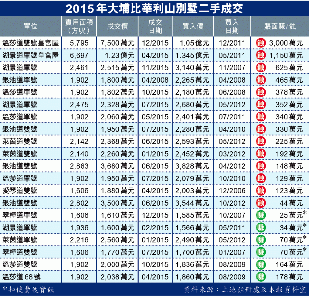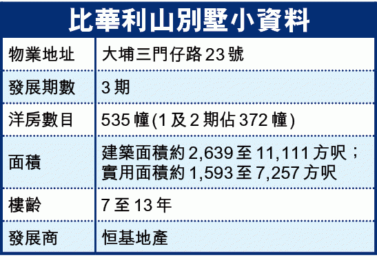 【本報訊】樓市吹冷風,豪宅勁蝕個案逐步升級。四叔李兆基旗下恒基地產(012)的大埔比華利山別墅一幢「皇宮屋」,新近以7,500萬元沽出,較購入價1.05億元賬面損手高達3,000萬元,連同釐印費及佣金等使費,勁蝕逾3,500萬元,登上今年最大宗豪宅「流血」個案,單是蝕讓金額已足夠買10伙沙田第一城細單位。