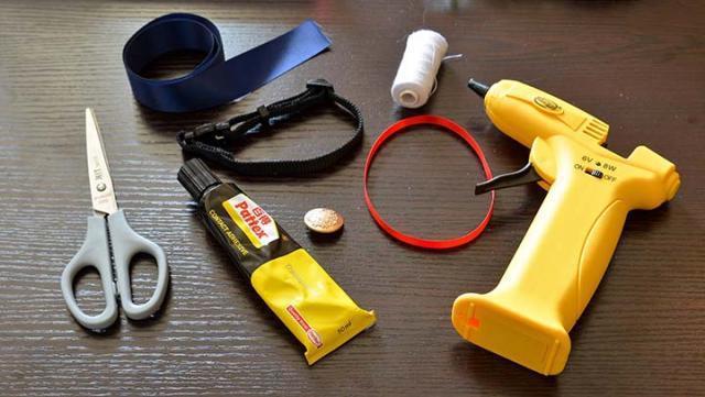 7. 用膠水把雙蝴蝶結黏在安全頸繩上便完成