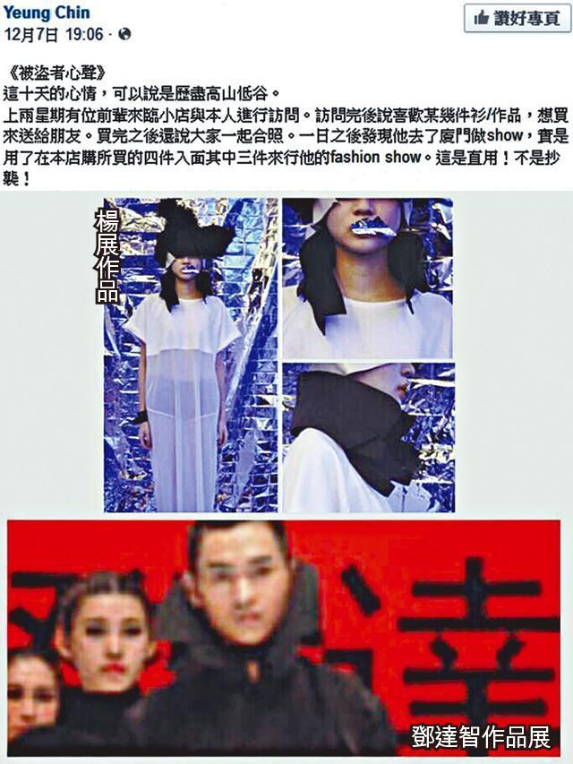 【中環】本地時裝設計師鄧達智(William)早前在廈門開個人作品展時,因將新晉設計師楊展的作品「據為己用」,未有冠名出自楊展設計,而遭對方以「前輩」之名,在facebook貼文《被盜者心聲》狂呻此事。未知是否受此風波影響,William昨日突然缺席尖東一個鞋履設計比賽。不過他就在facebook貼出Rosemary婚照,介紹是自己的出品。