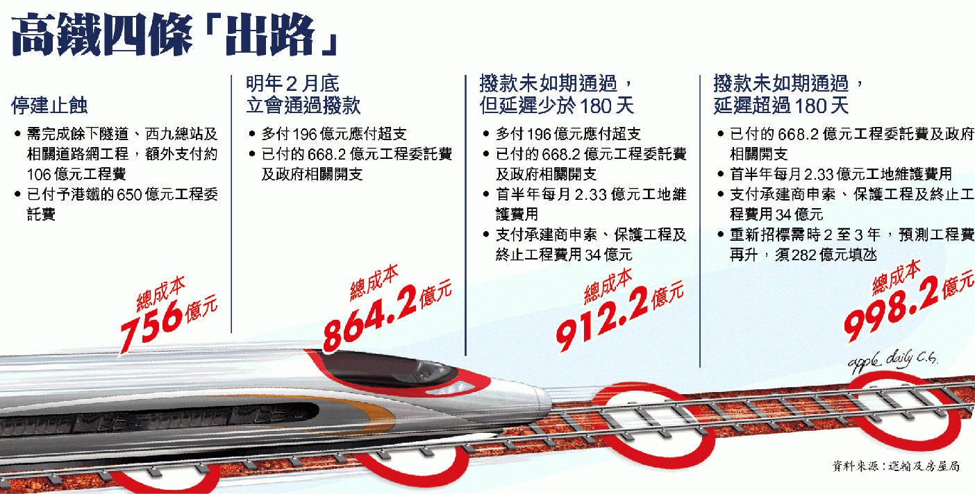 對於民間有聲音要求「離場」為高鐵項目止蝕,運房局亦有為止蝕方案做研究。文件指出,若全面放棄高鐵項目,會損失已向港鐵支付的650億元委託費。港府為確保市民安全,及恢復工地附近的道路網,政府也需額外申請不少於106億元撥款,完成餘下爛尾的隧道及車站工程,以及在西九總站附近興建道路。日後每年也需以1億元保養爛尾設施,總成本為756億元。惟方案成本仍較繼續興建的填氹方案便宜近100億元。