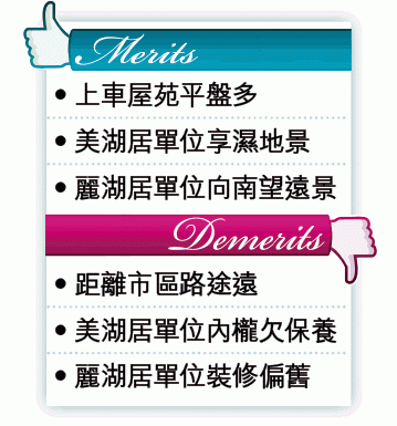 事實上,6期美湖居現時一般低層樓景放盤,叫價由350萬元起,近期中低層單位成交價最平亦要330萬元。介紹的高層單位,廳房一律享有濕地遠景,客廳向東北,睡房向西北,座向一般,勝在景靚兼光猛。單位內櫳裝修欠保養,開價380萬元,以高層靚景戶而言屬平價,早前樓市未轉差時,此戶叫價仍高達400萬元,主動下調叫價5%的優質景觀單位選擇不多。