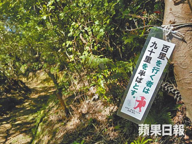 指示牌寫着「行百里者半九十,此言末路之難」,語出《戰國策》,目的是鼓勵遍路者快到目的地,更要繼續努力,不要放棄。