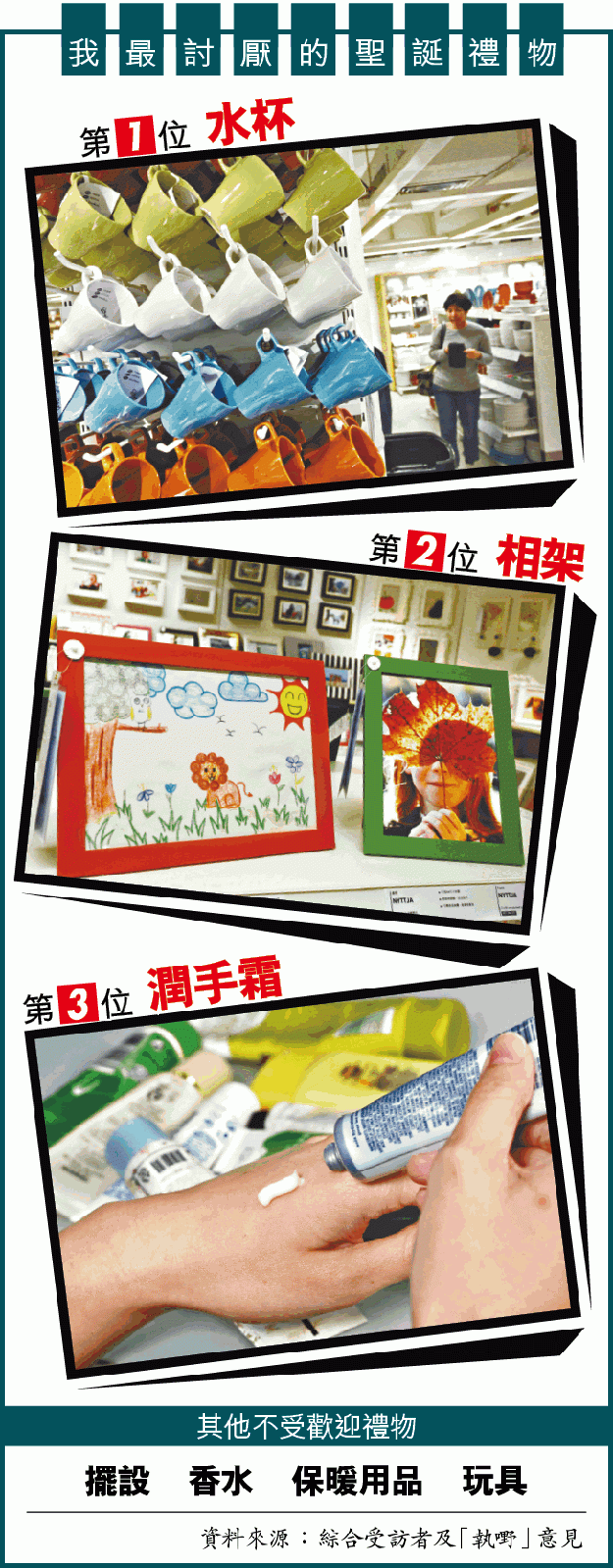 坊間一般不想收的禮物「絕交三寶」包括杯、相架及錢罌,《蘋果》訪問部份市民,了解最不想收到、及曾經收過最不滿意的聖誕禮物,結果「中了兩寶」,包括杯及相架。