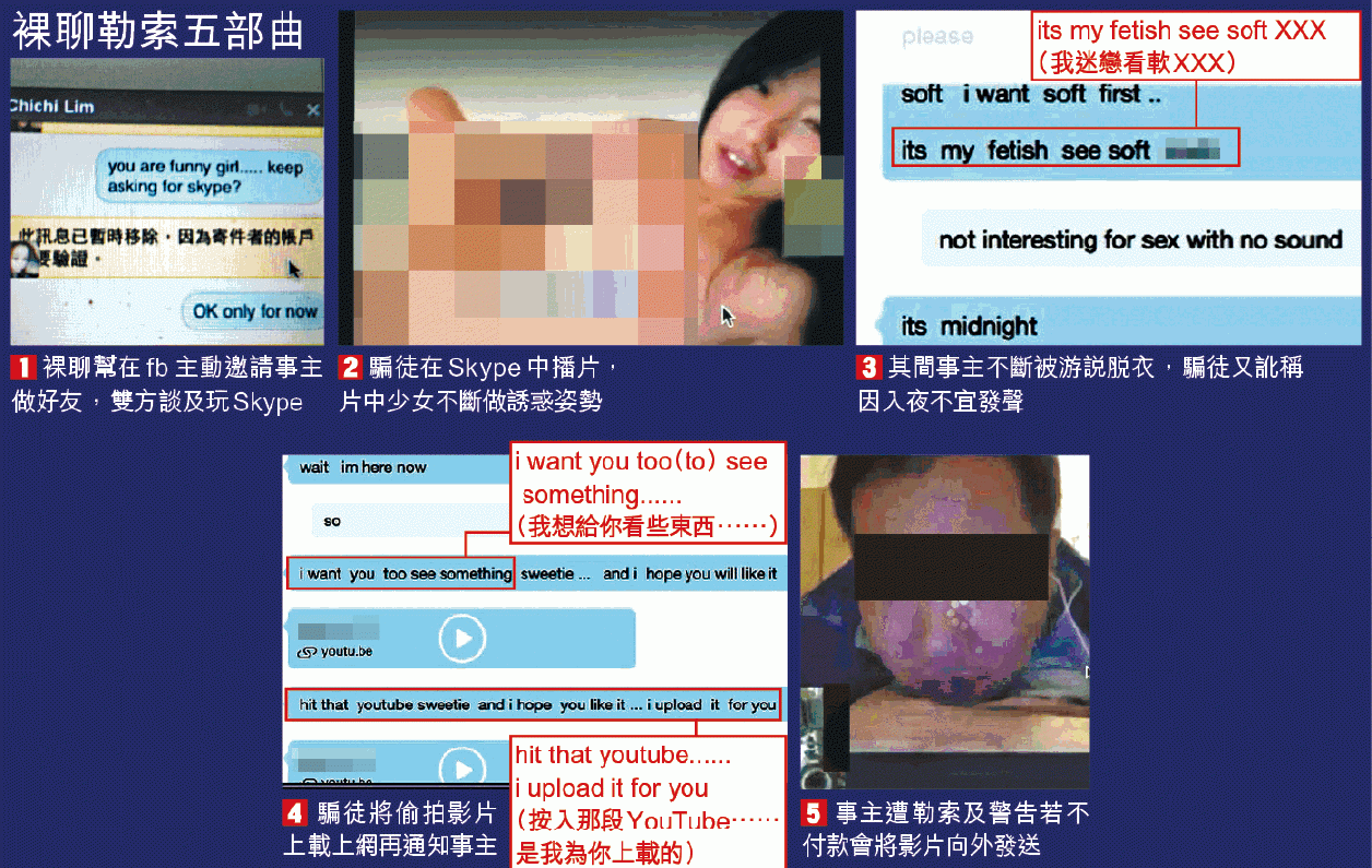 但本月17日深夜,一位自稱來自新加坡叫ChiChi Lim少女,先是Like了他的fb,再死纏不休暗示欲嘗試網絡性愛cyber sex,他一時心軟加好奇,終答允用Skype以英語及視像與對方聊天。