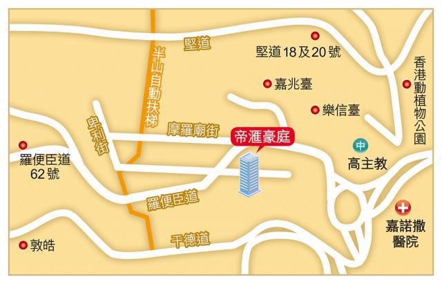 物業座落羅便臣道頭段,商店食肆集中鄰近半山自動扶梯一帶,距帝滙豪庭3至5分鐘步程,沿自動扶梯可抵堅道,搵食購物選擇較多,續往中區方向走可抵蘇豪區,特色食肆及酒吧林立,消遣娛樂就腳。