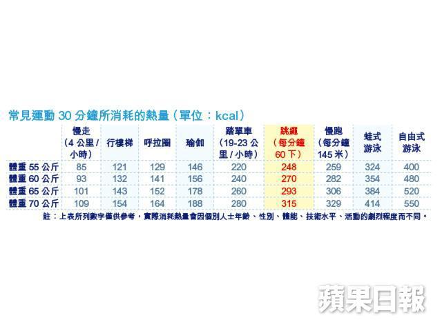 一般消耗熱量較多的運動,使用肌肉組群都會較多。雷雄德指,很多人以為跳繩是簡單運動,其實它是消耗熱量偏多的運動,「上下跳動時,使用的肌肉組群相當多,包括大腿四頭肌、小腿肌肉,還有身軀肌肉和手臂,所以雖然動作簡單,但熱量消耗效果非常大。」有研究指,每天花30分鐘持續跳繩(每組60至80下),可消耗200至300kcal熱量。他建議,每天至少持續跳繩15至30分鐘,每3至5分鐘一組,但提醒跳繩對有膝傷患或腰背痛人士未必適合。