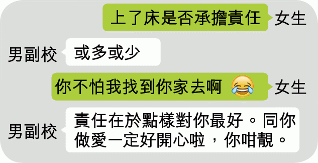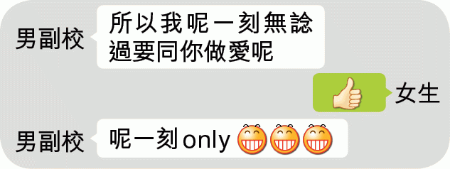流出的短訊亦發現大量情慾對話,男副校去年6月上旬說:「我呢一刻無諗過要同你做愛呢」,女生發出讚好圖示,男子則語意輕佻回應:「呢一刻only」。男副校其後更露骨直說:「同你做愛一定好開心啦,你咁靚」,又哄女生指上床後「或多或少」會承擔責任。