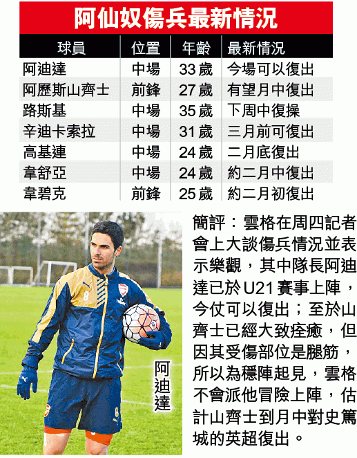英足盃第三圈,兩支英超球隊交鋒,衞冕的阿仙奴在阿聯酋球場迎戰新特蘭。兵工廠領隊雲格表示會派一個較強的陣容出戰,儘管奧斯爾有機會休息,但禾確特及艾朗藍斯等都很大機會擔正。至於新特蘭主帥艾拿迪斯則表明護級為重,會大規模輪換,所以今場一於熱捧阿仙奴[-1]「主勝」!