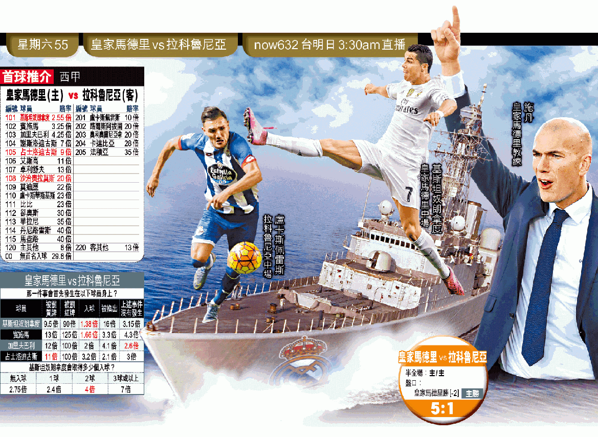 新人事新作風,皇家馬德里新任教練施丹,周六領軍首戰主場出擊,面對近況下滑的拉科魯尼亞,「銀河艦隊」球員齊心向新帥獻媚,可望大勝拉科響頭炮,皇馬[-2]仍可照取「主勝」。