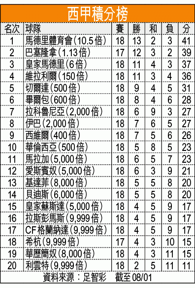 雖然獲得休息的前鋒路爾斯阿拔圖、中場盧卡斯佩雷斯可復出,但仍有前鋒施素波格斯、門將法比等傷兵,以近六季作客皇馬全輸,上季兩遇皇馬全輸兼累積失10球,周六再訪巴拿比奴,恐凶多吉少。文:牽牛