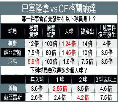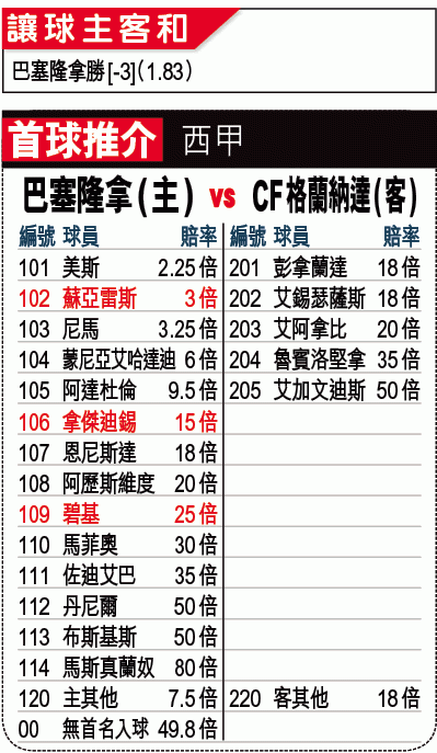 巴塞隆拿在上輪聯賽失分,榜首位置被馬德里體育會取代;巴塞已在周三西盃回勇,大勝一場,今晚於西甲迎戰CF格蘭納達,勢大破對手,[-3]照捧巴塞「主勝」。(球賽編號:星期六32;now632台今日11:00pm直播)