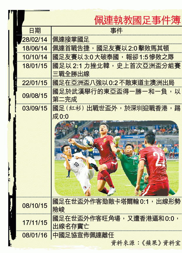 佩連在前年二月上任,執教國足23個月期間,28戰得14勝10和4負。他的代表作是帶領國足在去年初的亞洲盃分組賽三戰全勝,以小組首名打入八強。然而,在去年下半年,國足於世盃外次圈兩遭香港逼和0:0,作客卡塔爾又以0:1敗陣,出線機會非常渺茫。另外,兩戰國足均保不失的港足門將葉鴻輝,接受訪問時對佩連下台不作評論。