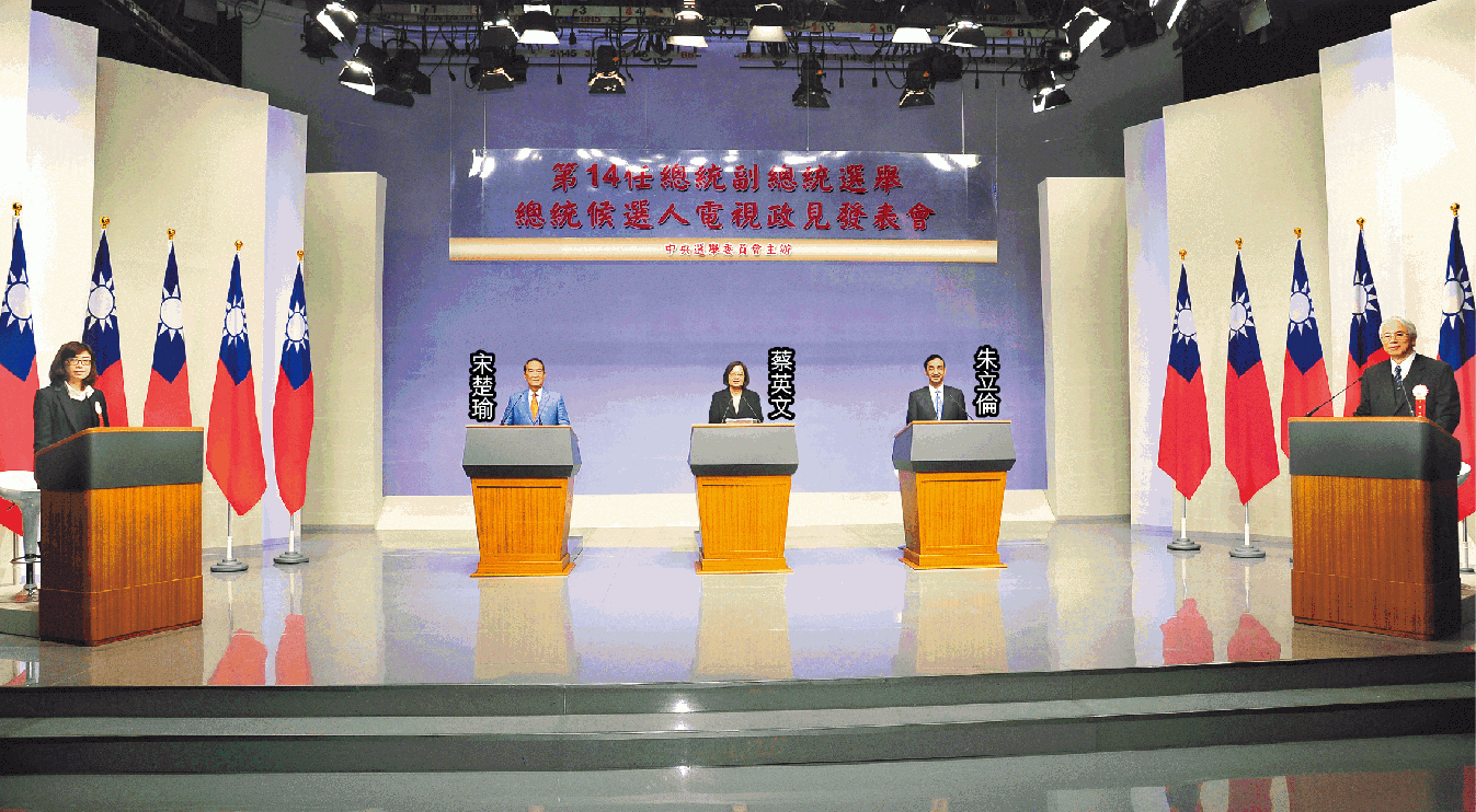 台灣2016年總統大選進入倒數。國民黨朱立倫、民進黨蔡英文和親民黨宋楚瑜三名總統候選人昨最後一次交手,在電視發表政見。朱立倫繼續以「十大政綱」鼓動人心;蔡則大打「族群融合」牌玩煽情;宋繼續「左右開弓」既批朱又踩蔡,「以老賣老」稱台灣「需要他這樣的領導人」。