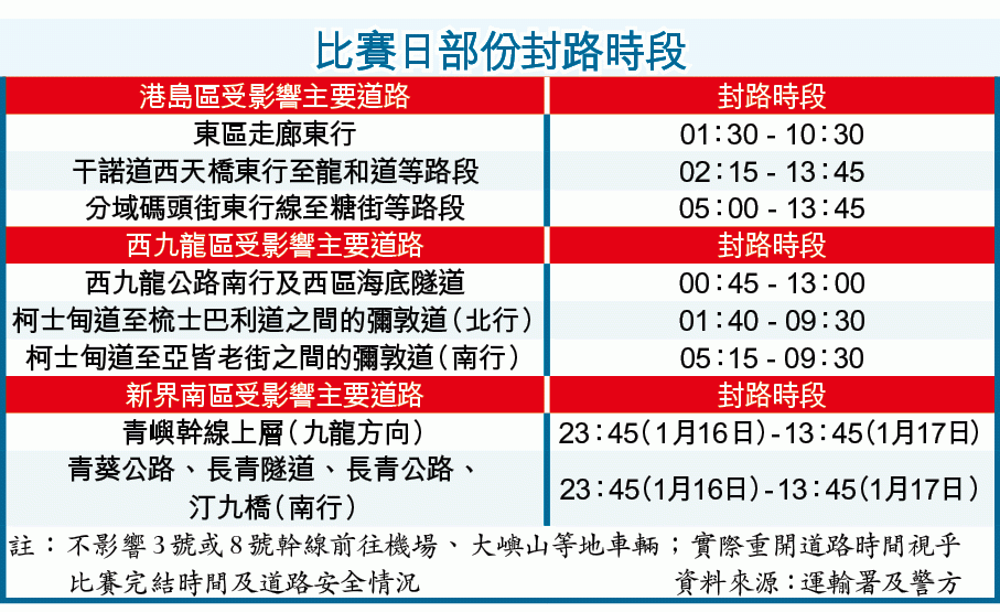渣馬比賽當日會有一系列的封路措施及安排,新界南區的青嶼幹線九龍方向上層會早於16日晚上11時45分開始封閉,其餘主要道路如九龍彌敦道、港島東區走廊東行線及西區海底隧道等多條道路會於17日凌晨逐步封閉,然後視乎比賽的實際情況及道路安全下重開各道路。